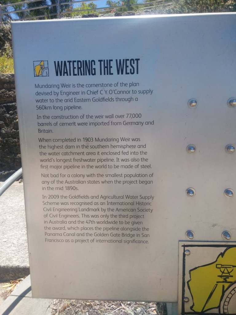 On a more personal level, I remember as a child we visited the weir often, as a family and as part of a youth group with a campsite nearby. I always found it interesting and it has a beautiful setting, surrounded by hills and jarrah forest. As a teenager, my family moved to a wheatbelt town, and the water we drank came from the pipe. The pipe ran under our front garden, though I hasten to add we didn’t have a tap connected directly, since the size of the pipe means it stands as tall as a person when it runs above the ground.