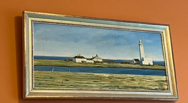 Hurst Lighthouse off the Isle of Wight. Which painting is in the exhibition and which is hanging in my living room, given to me in exchange for knitting the artist a scarf?